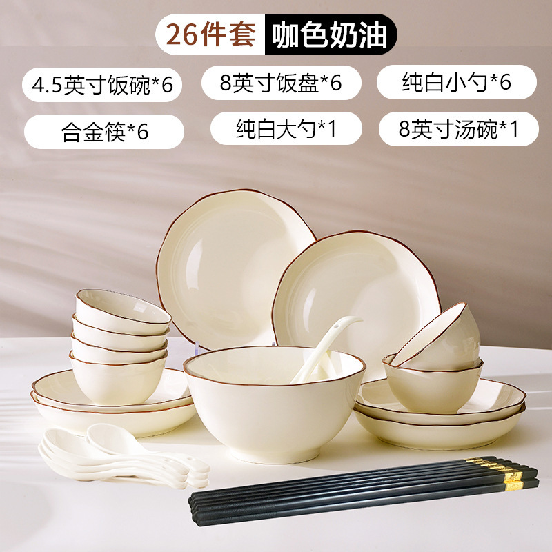 Free combination gift, high aesthetic value, light luxury coffee color, cream, household ceramic tableware set, bowls, plates, noodles, soup bowls, fish dishes