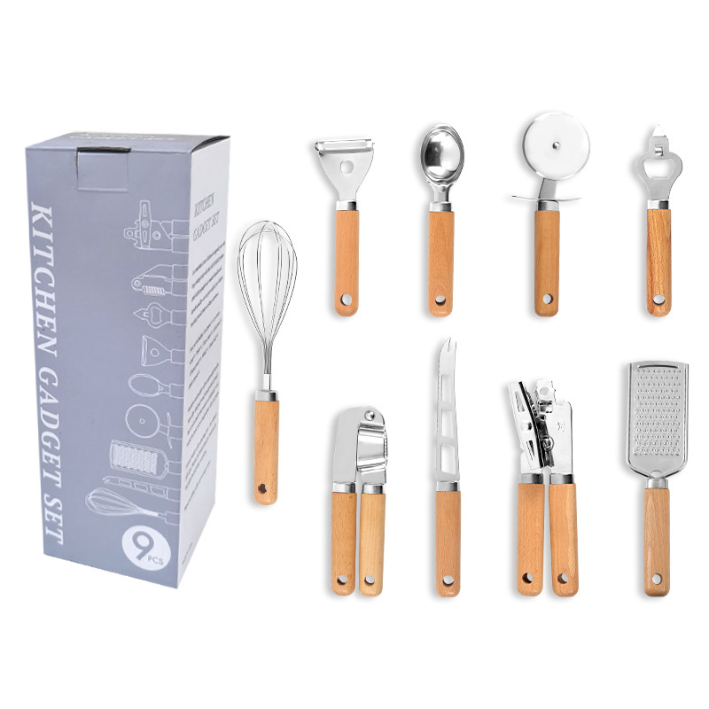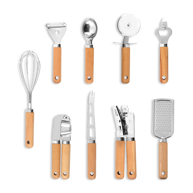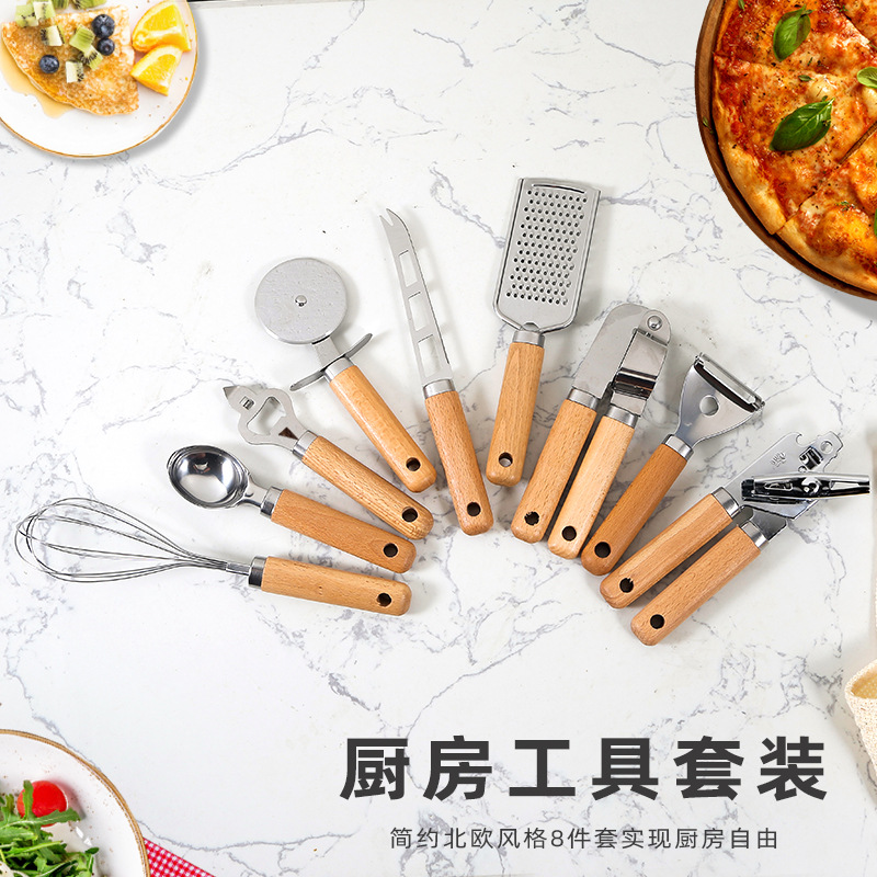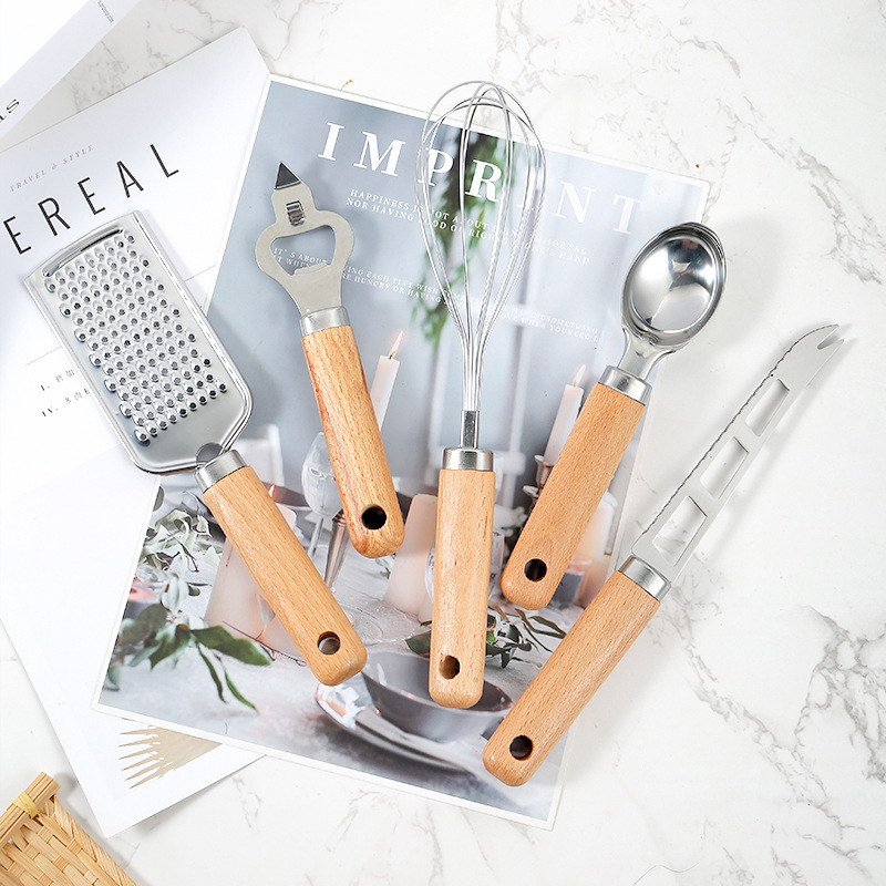 Kitchen small tool with wooden handle, stainless steel egg beater, miscellaneous baking set, pizza cheese knife, planer