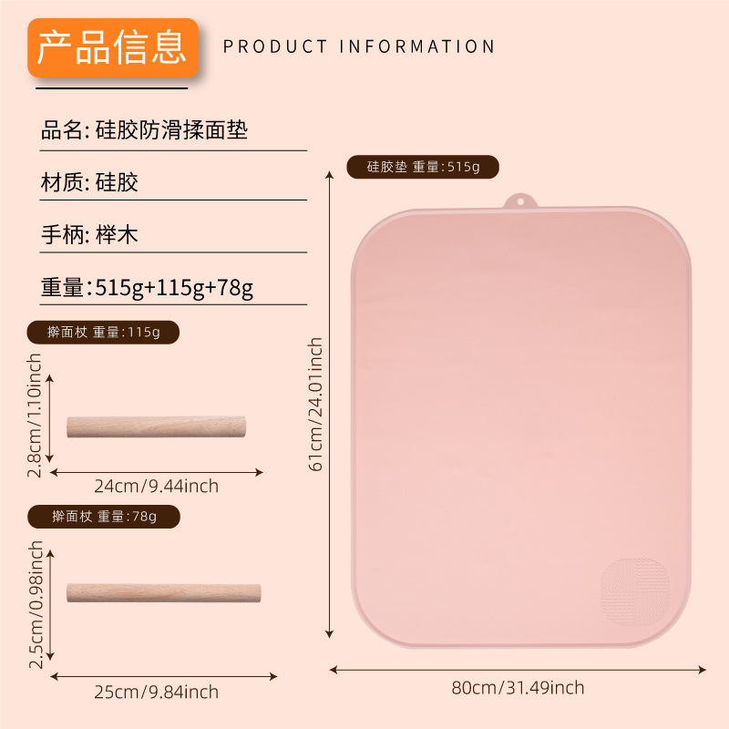 Silicone kneading pad, thickened anti slip rolling pad, rolling pin, flour scraper baking 3-piece set