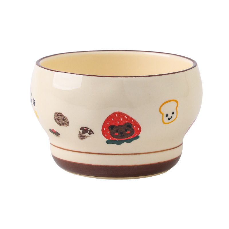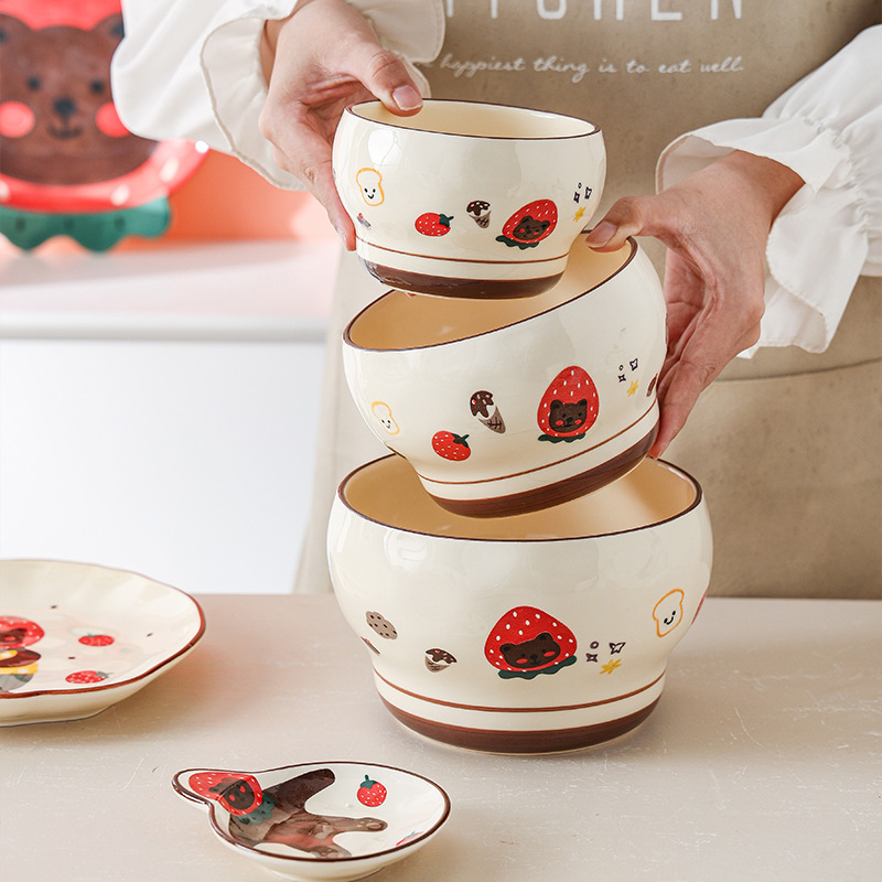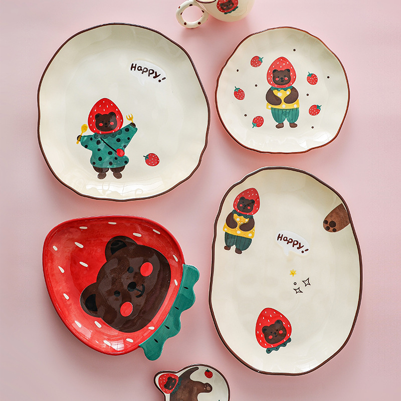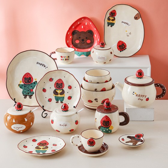 Specially beautiful strawberry bear bowl and dish set, household ceramic tableware with cute and high appearance, bowl and dish combination, chopsticks and spoons