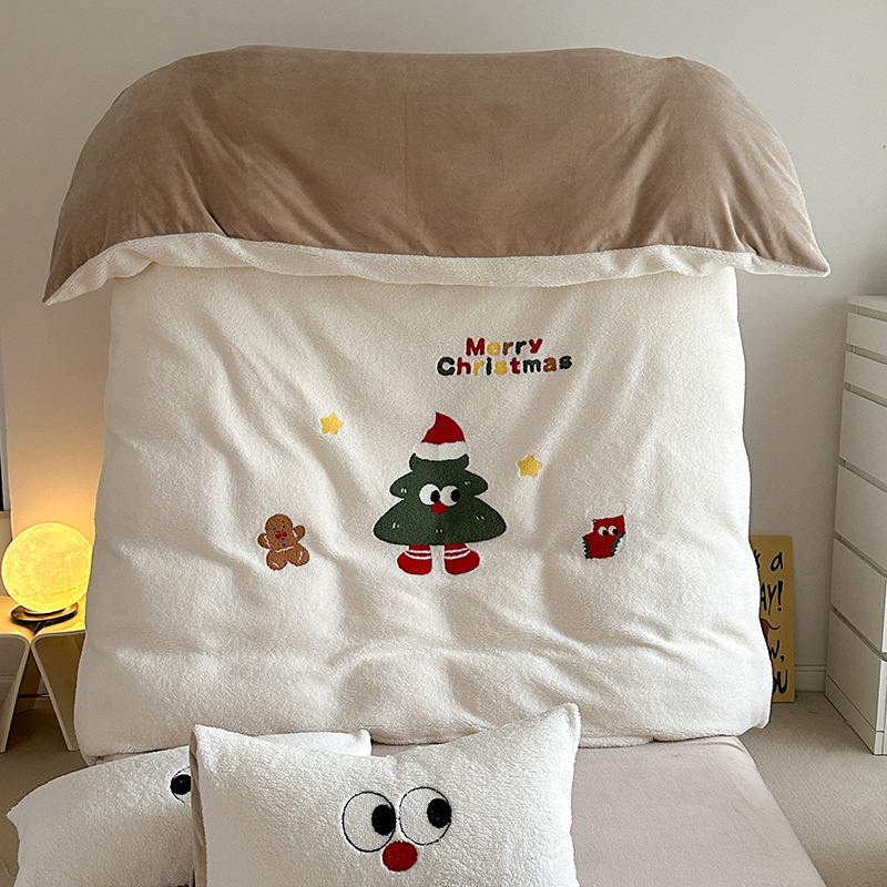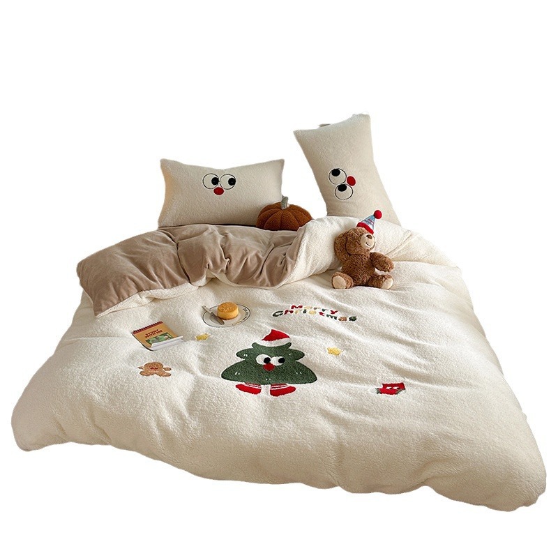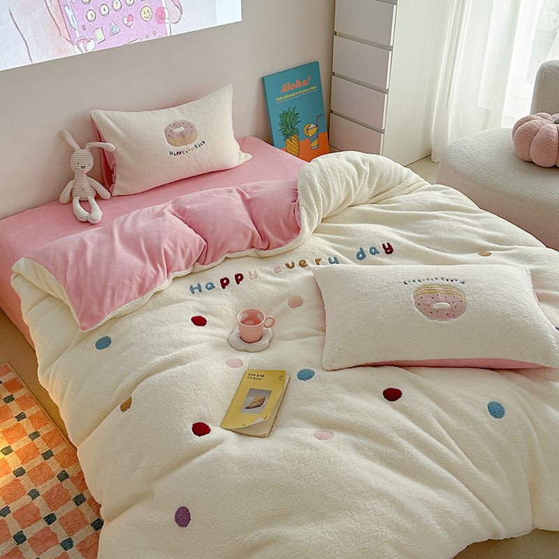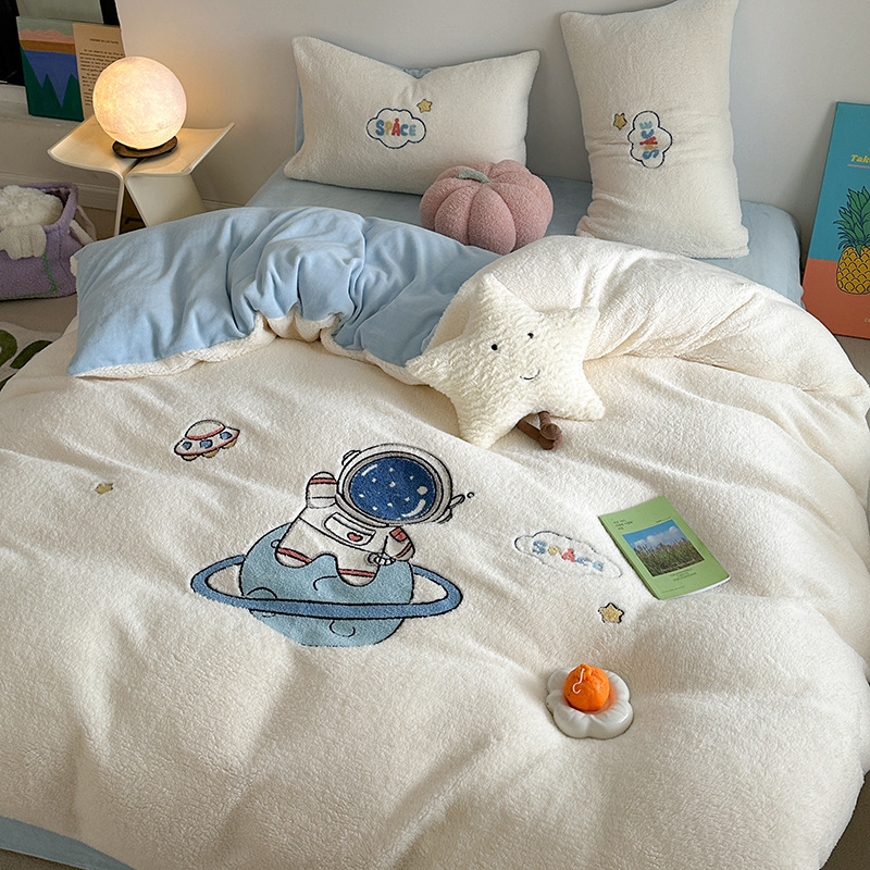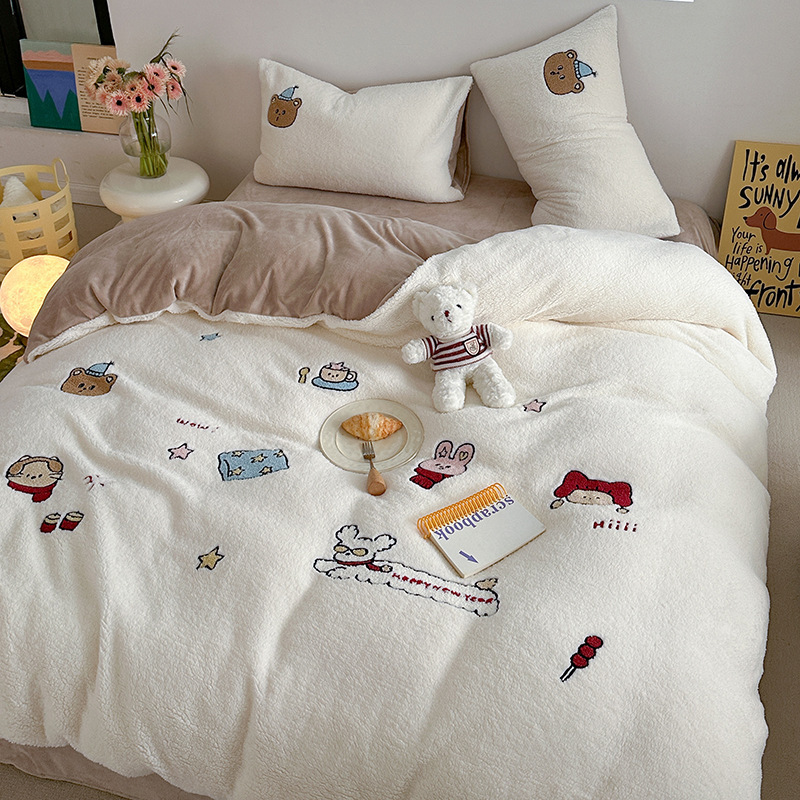Winter Thick Milk Velvet Four Piece Set ins Cute Cartoon Sheep Velvet Towel Embroidered Bed Sheet Bedding Set