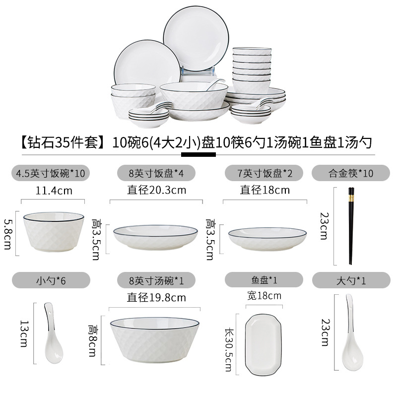 Diamond 35 piece set, 10 bowls, 6 (4 large and 2 small) plates, 6 spoons, 10 alloy chopsticks, 1 soup bowl, 1 fish plate, 1 large spoon (+$9.97)
