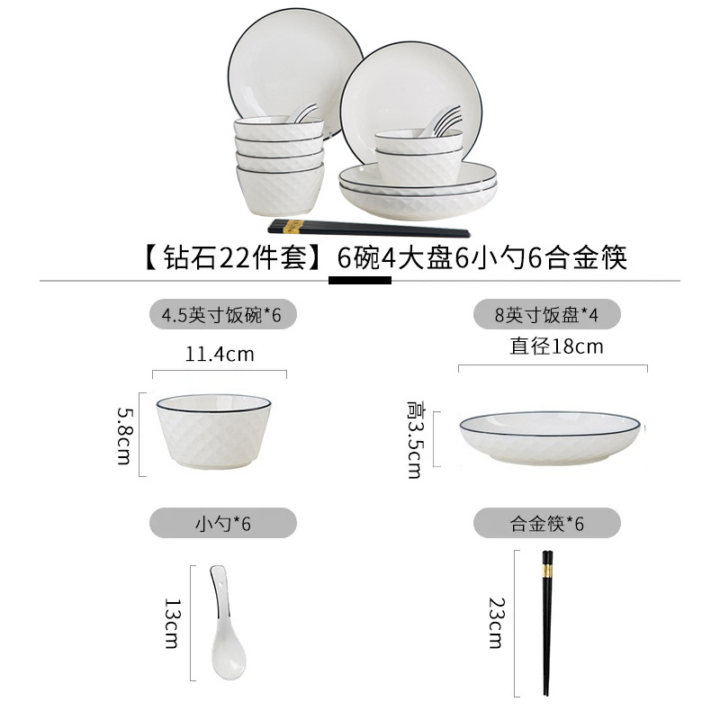 Diamond 22 piece set, 6 bowls, 4 large plates, 6 spoons, 6 alloy chopsticks (+$2.40)