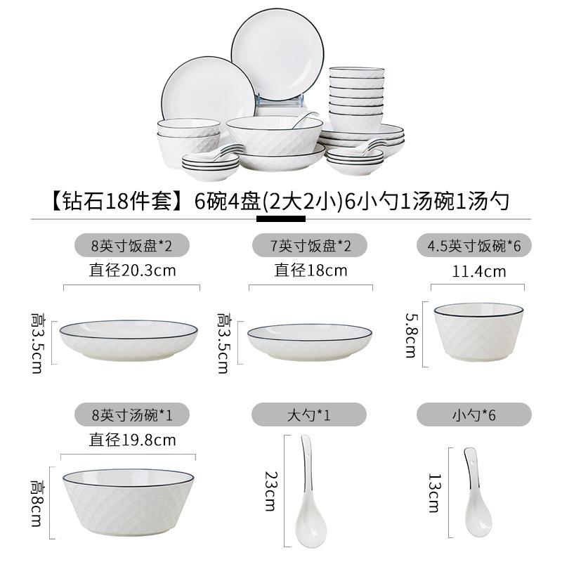 Diamond 18 piece set, 6 bowls and 4 plates (2 large and 2 small), 6 spoons, 1 soup bowl, and 1 soup spoon (+$2.58)
