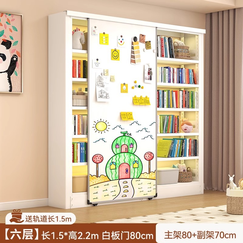6-story bookshelf with a length of 1.5m and a height of 2m, including a whiteboard door with a width of 80cm. The delivery track is 1.5m long
